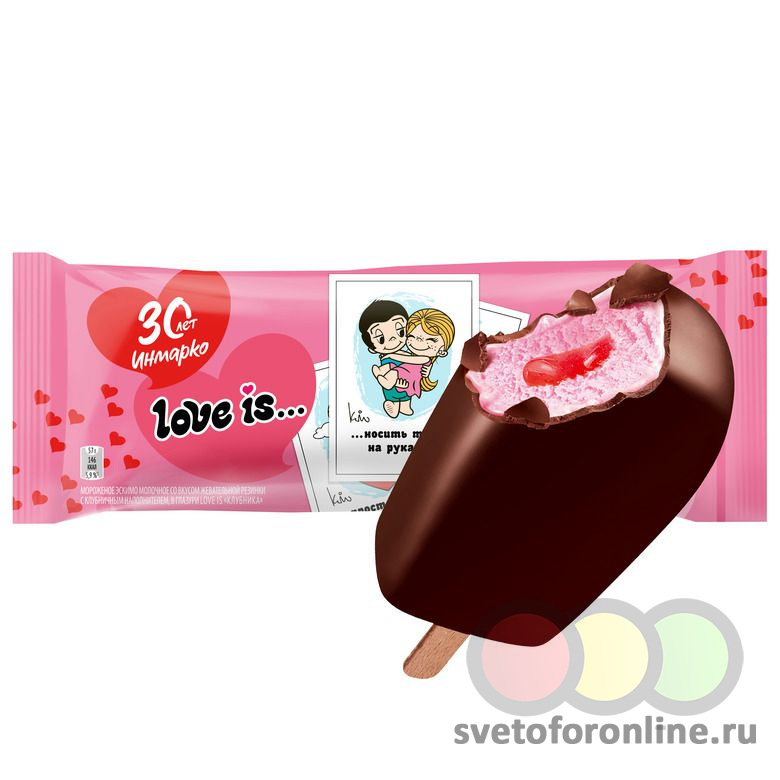 Мороженое Эскимо LOVE IS молочное со вкусом жевательной резинки с клубничн.нап.12% 80 мл (57гр) БЗМЖ - Купить в магазине "Светофор" город Погар, ул.Полевая, 24/1