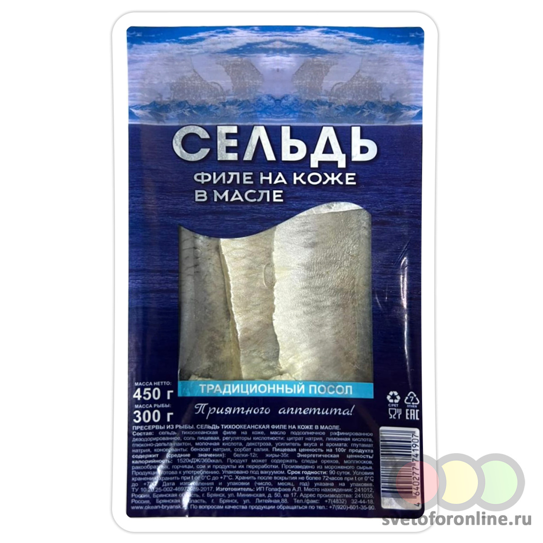 Сельдь филе на коже в масле ТМ "Океан" 450 гр Голафаев А.Л. ИП (производитель) - Купить в магазине "Светофор" город Погар, ул.Полевая, 24/1